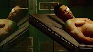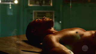 This week's fourth episode of the sci-fi series Blood Drive once again got its two leading men to show skin. Thomas Dominique showed a bit more rear nudity as his first scene featured his character, Christopher, running through a field while naked. It turns out to be a dream as he wakes up still captive at Heart Enterprises. He remains naked for that as he becomes a further victim of Aki's sexual torment. His co-star Alan Ritchson doesn't get naked but he does show off his great chest for multiple scenes inside a mental hospital. His character, Arthur, is stripped out of his cop uniform in order to more blend in with the dangerous patients running rampant throughout the hospital.