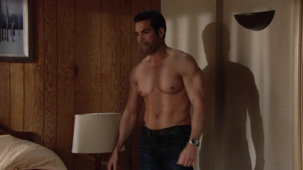 Jordi Vilasuso is back in the Soapy Sunday spotlight again this week. The January 14th episode of The Young & the Restless picked up where the previous episode left off with Jordi's character, Rey, having taken refuge in a motel with his colleague Sharon. The two ultimately shared a bed, with Rey sleeping shirtless. While nothing romantic occurred between them, things were still awkward the morning after. Rey remained shirtless as he emerged from the bathroom, showing off his great chest before ultimately putting on a shirt.