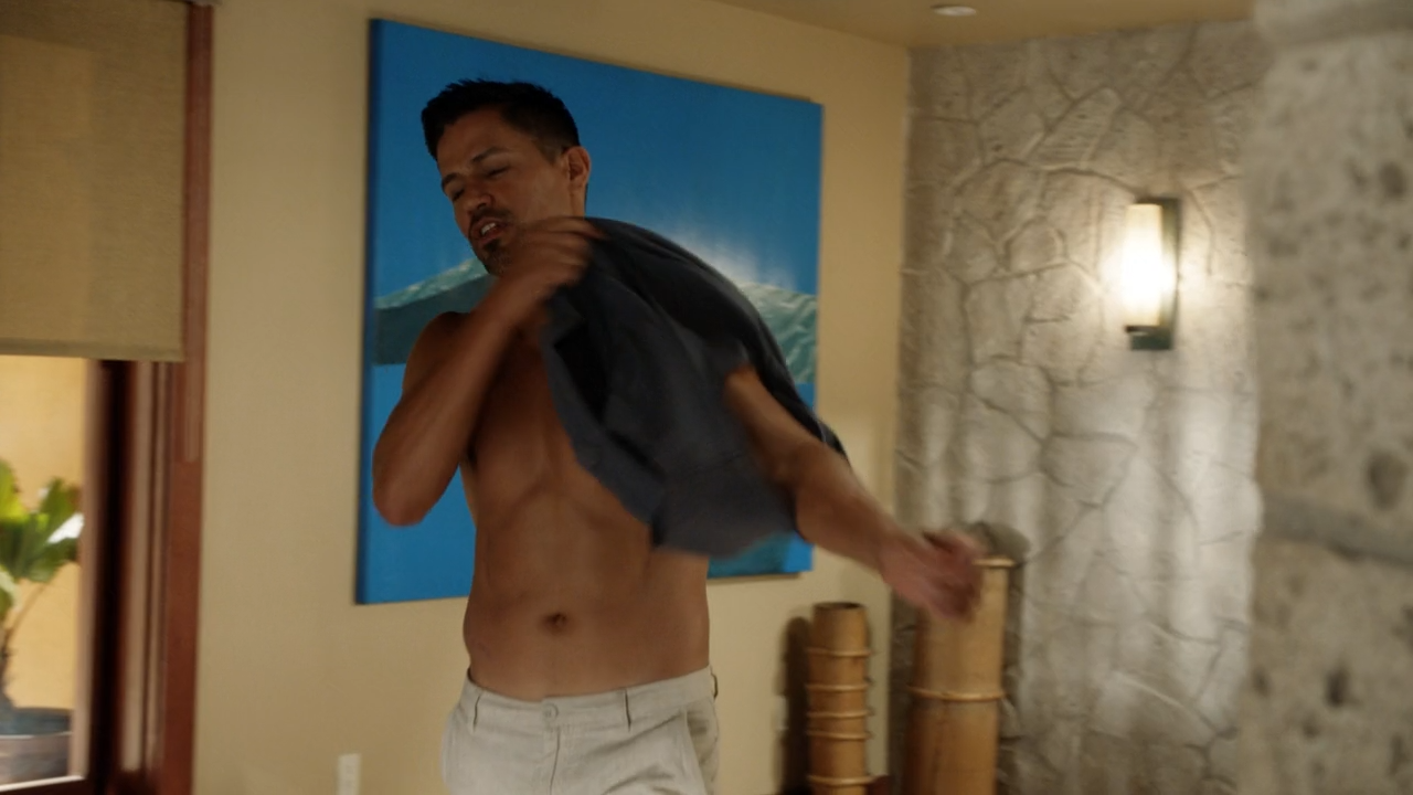 Episode 3 of the new season of the CBS crime drama Magnum P.I. got leading man Jay Hernandez shirtless once again. Jay's character Magnum spent some topless time in bed with a new potential love interest at the start of the episode. Things got awkward when his other love interest Higgins arrived at his house, finding his new lady friend in the kitchen. He walked into the room, as he was putting on his shirt.