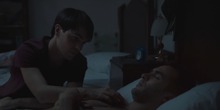 The Spanish film Mía & Moi centers on the title siblings who reunite at their remote childhood home after the death of their mother. Moi (played by Ricardo Gómez) brings along his mild-mannered boyfriend Biel (played by Eneko Sagardoy) who attempts to help him deal with his loss, his past and his persistent mental illness, which draws him closer to his sister. When her obsessive and possessive former boyfriend Mikel (played by Joe Manjón) shows up after being injured in an accident, tensions rise even more. When Mikel attempts to regain Mía's favor, and appears to befriend Biel, Moi grows more unstable, leading Mikel's behavior to escalate and trigger Moi's mental demons, leading to a violent incident, changing all of their relationships for good. Ricardo & Joe both showed rear and frontal nudity during the film, while Eneko appeared shirtless.