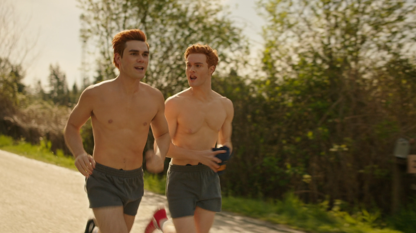 This week's new episode of The CW drama Riverdale was another of their musical offerings. Episode 14 of the seventh season found Kevin (played by Casey Cott) writing a musical about teenage life with his boyfriend Clay (played by Karl Walcott), which led to their friends auditioning to play their own fictional selves. This led to Archie (played by K.J. Apa) competing with his fellow redhead Julian (played by Nicholas Barasch) for the part of Archie in the musical. Their audition montage included them racing one another before ditching their shirts and later taking a steamy shower together in the locker room. Karl got to lose his shirt as well, as the episode also featured Clay & Kevin having sex for the first time and Clay making a quick exit in his underwear the next morning. Cast member Charles Melton got to show off his muscles in his basketball uniform as Reggie appeared as part of the episode's opening musical montage.